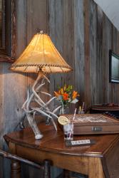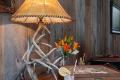 In the main living area, the stone fireplace and reclaimed wood mantel sit below a massive bull’s head. At 6’ tall, the bull’s head wasn’t something the homeowner anticipated in the space. “Initially, I didn’t want any animal heads mounted in the pool house,” she says. “But when I saw the bull I knew it was the perfect fit for above the mantel. It is the best part of the room.” Other stylish furnishings include a cowhide sofa, antique coffee and end tables and a comfy leather chair embellished with a horn pattern on the sides and studded detailing.