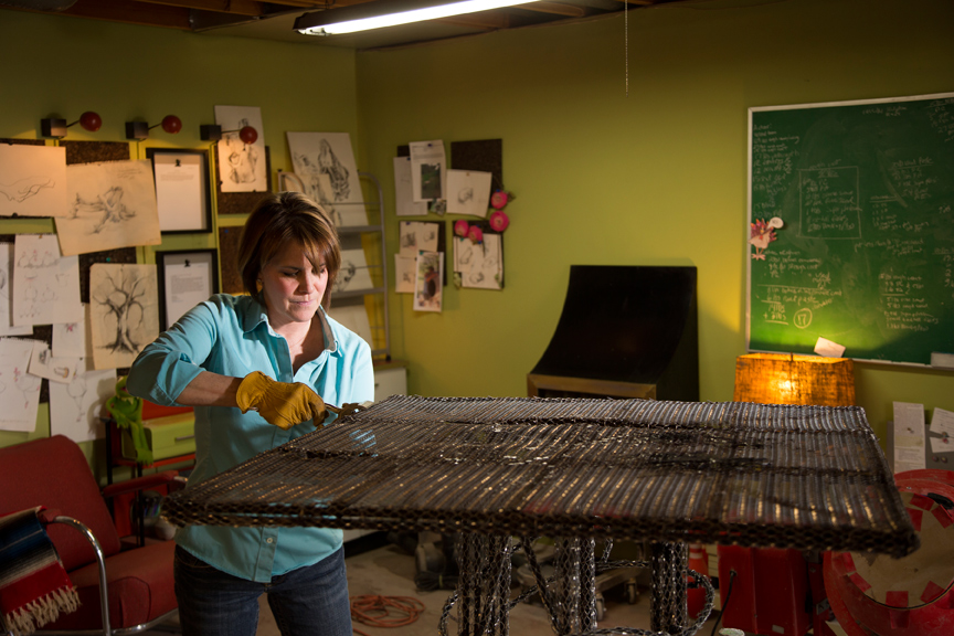 Even so, she is passionate about her work. “I love every bit, even cutting the rebar,” she says. “I put a little ‘bluebird of happiness’ on all my pieces because this makes me so happy.”