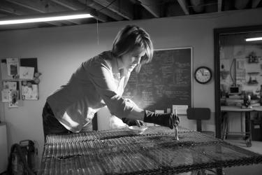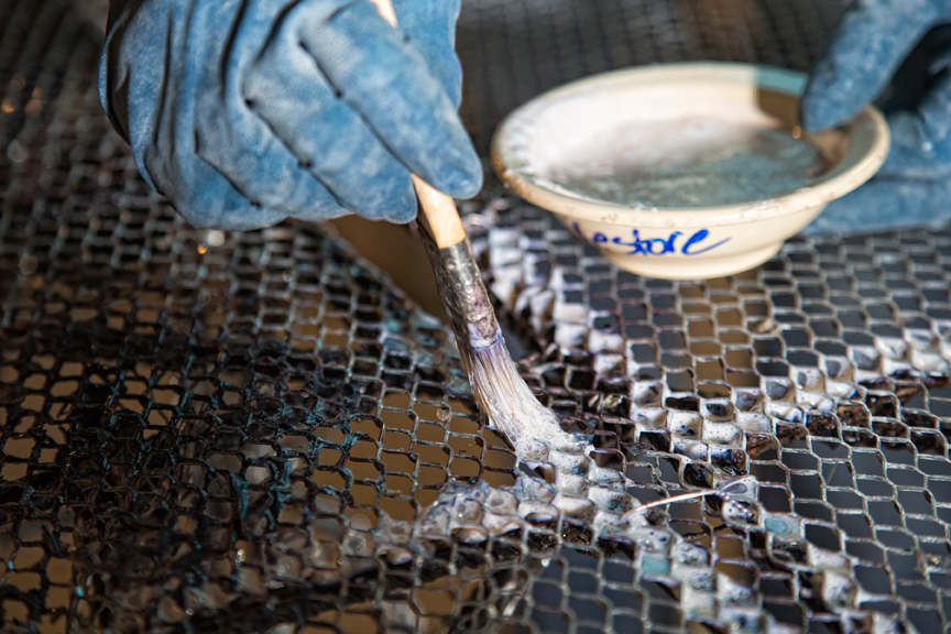 Working with real timber certainly would be easier. Each custom-designed piece takes a minimum of a month to complete. First, Davis creates a frame out of rust-inhibited rebar and wraps it with steel lathe. She uses safety twist pliers to clamp the mesh to the rebar. The pliers whirl wire easily, as if it were cotton candy, which just might be the coolest part of the whole process.