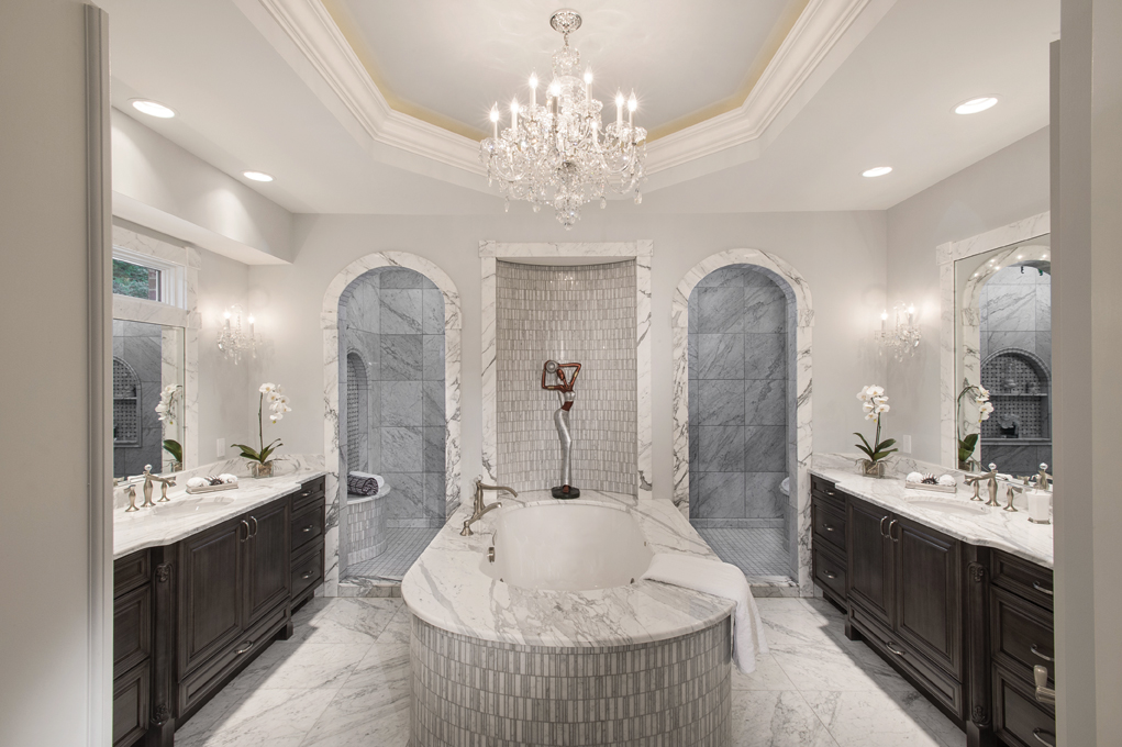 A total of 670 square feet of 18”x18” Venatino marble tiles and hundreds of AKDO Carerra marble trim pieces were used and hand-selected to achieve a flawless image of grace and function. Your eye is drawn to the arched door casings that are detailed with keystones as well as the window casings, vanity tops and tub deck. The three slabs of Calcutta Oro add movement and interest. The weathered slate stain on the vanities provides a beautiful contrasting element to the marble and evokes balance and harmony. As you step into the double-entry shower, three insets draw your attention. Adorned with a mosaic overlay and a basket weave mosaic inside the inlays, the insets are the perfect place for storing shower essentials. To complete the elegant look, fine crystal detail on the plumbing and lighting fixtures create a beautiful illuminated radiance.