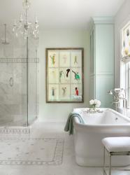 For a soothing effect, the walls are painted a soft mint that becomes a neutral without being too overwhelming. The showpiece of the master bath is the collection of original Marcel Vertes watercolors the homeowner had framed in multiples. The paintings are a series of nine dancers, and again, the movement in the piece reflects the curvature in the tub.