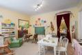 Lee Halliburton, formerly of St. Louis, painted the space in two days incorporating a palette of soft pastels, leaning mostly towards pinks and greens. A whimsical nod to the family’s love of Yorkie dogs is evident in the cafe, as well as some other sweet fuzzy friends: a bunny in the classroom, and a kitten in the kitchen window. Colorful family handprints accented with bric-a-brac adorn the wall over the school’s chalkboard. The museum is a large framed board covered with cloth that leans against the wall displaying the latest artistic renderings of the children. Ionic columns and some ivy offer a bit of gravitas. The dressing room, designed by New Space, offers plenty of storage for costumes, games and dolls. Karen and Jim's grandkids look forward to trips to grandma and grandpa's house where they can get lost in their imagination in their amazing playroom.