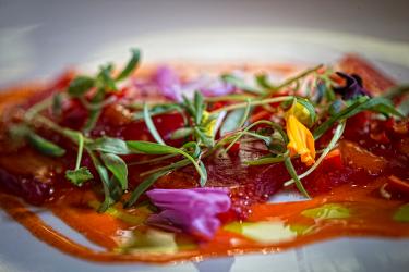 Hawaiian Ahi Tuna, Thin and Raw: Lemon, orange and carrot juice, fresh ginger and white soy sauce simmer into a syrupy glaze for thin slices of tuna. A spritz of lemon juice, fresno chilis and micro cilantro are the finishing touches.