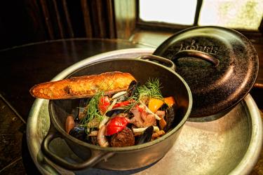 The décor and the food both draw from old and new. In the dining room, stained-glass windows and a wood-burning fireplace are original to the building, which dates to the 1930s. Updated touches include a floor-to-ceiling, climate-controlled glass wine wall and pleated, red light shades that were installed during a renovation two years ago. “What the menu has become is an amalgam of traditional American foods, new American foods and traditional English foods,” says Rex Hale, corporate executive chef for LHM International, which bought the Cheshire in 2010. You might find spit-roasted chicken, pork belly with white cheddar grits and fish and chips on the menu. Grilled prime rib with Yorkshire pudding is a longtime favorite, but today the beef is locally raised, from Rain Crow Ranch near Doniphan, MO. “We do farm-to-table, seasonal food,” says Hale, who serves as executive chef of the Cheshire complex, overseeing The Restaurant along with Basso, a subterranean, Italian-accented gastro pub, and Fox and Hounds tavern. Serving local foods is easier in some seasons than others, of course, but even in the dead of winter he sources tomatoes that are grown in a local greenhouse and greens from EarthDance Farms in Ferguson.
