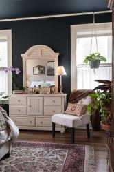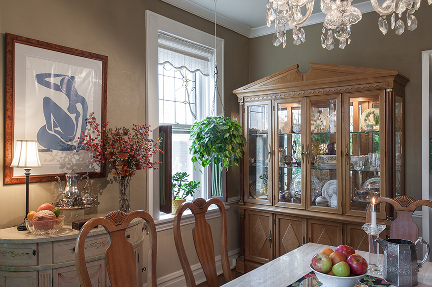 Just down the hall, Carlin’s master bedroom faces her quiet, tree-lined street. “I love the light and views in this room,” she says. An antique wardrobe holds bedroom necessities and has been through three moves with her. Structurally, Carlin turned what had been a fifth bedroom into her master bathroom, which allowed for a large bathtub next to the window. She also turned three closets from the master, fifth bedroom and hallway into one large closet with plenty of storage. “You can be creative with space in an older home without compromising the integrity of the structure,” Carlin explains.