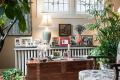 In the second-story sunroom, natural light hits every inch of the space. With the assistance of her trusted houseman, who has worked with her for 20 years, Carlin vaulted the ceilings and added a skylight, so natural light abounds. Surrounded by houseplants, the sunroom really brings the outdoors in. With a picture-perfect view of her garden, the sunroom is where Carlin does her correspondence. You won’t find any electronics in this space. A delicate, white writing desk that belonged to her paternal grandmother is where she gets down to business. The room is also filled with old family albums and mementos. A set of steps leads to a set of French doors that open to a tucked away wooden deck. It is the ideal spot to sneak away for a few peaceful moments throughout the day.