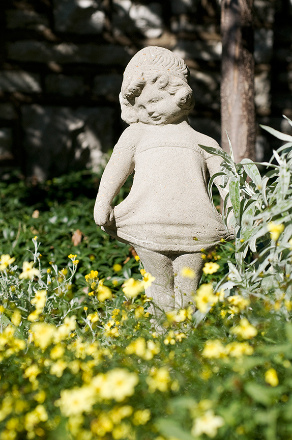 She also has discovered that some plants other gardeners consider invasive can be mainstays of her garden because they are totally controlled by the garden’s walls, walkways and foundations. In addition they have the ability to thrive in tough circumstances. Sweet autumn clematis covers the wrought-iron gates that open from the street into the garden. Groundcovers creeping liriope, with grass-like texture, and broad-leafed, trailing ajuga soften land-locked corners. Periwinkle (Vinca minor), tiny-leaved mazus with its purple flowers, and creeping phlox edge walkways. She loves the combination of lime green “Sum and Substance” hosta with blue flowered periwinkle and also is partial to the cool gray foliage of santolina and dusty miller.