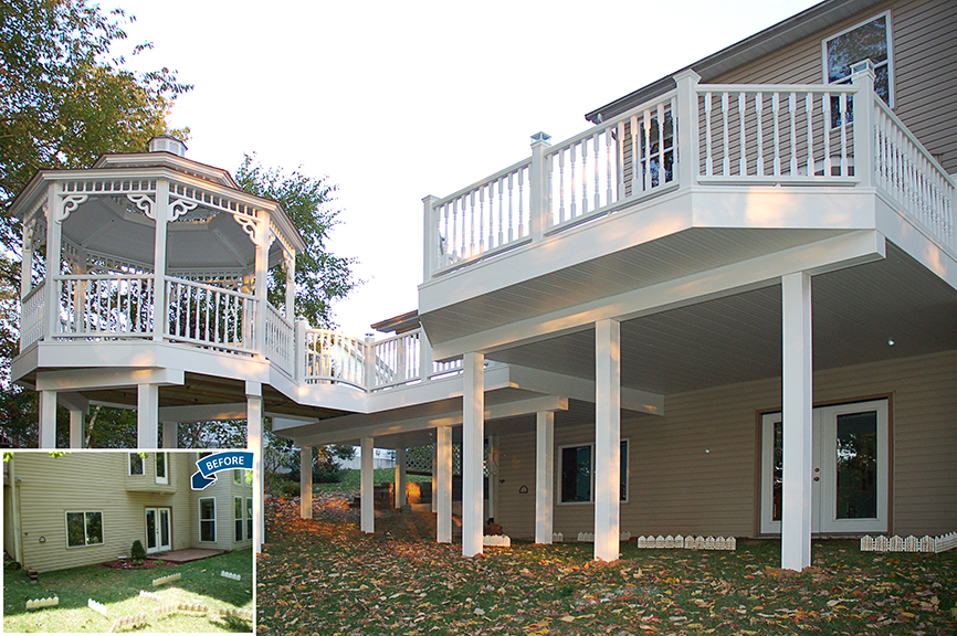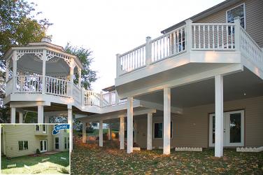 From day one, the deck is built in full width from the ground up. Construction crews begin by marking the 750-square-foot area and digging the holes for the structure’s supports. After inspections are passed, piers are put in place and framing begins. “The gazebo is really the starting point for the detailing,” says Mike. A pagoda roof with a cupola top covers the gazebo while decorative Victorian braces fill each corner between the roof and the structural posts. Victorian era spindles and a classic white coloring continues the Victorian theme throughout the deck’s design including an arched bridge walkway.
