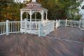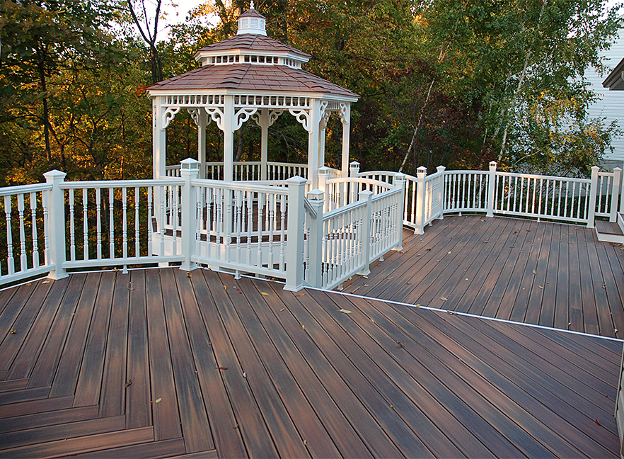An eco-friendly wood alternative floor color from Fiberon incorporates a color streaked wood look that mirrors the multicolored woodland background of the back yard. Brown hues contrast the crisp white paint, creating flow between the structure and the surrounding forest. The floor panels of the lower portion of the deck connected to the gazebo are laid out horizontally, which gives a visually interesting juxtaposition next to the angled panels of the upper section.