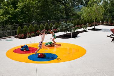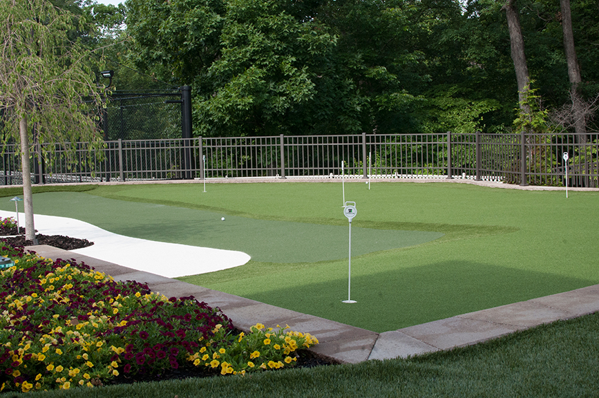 While the grandkids are horsing around the splash pad, the adults can find amusement on the putting green or the sport court, complete with volleyball net, basketball hoop and batting cage. A built-in sound, lighting and media system by The Sound Room allows Patty and Tom to control all the electronics – stereo, television, fans, and yard and pool lights – via iPad.