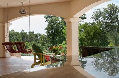 Patty and Tom took inspiration for their tropic-themed outdoor space from wood plaques they brought home from a recent trip to Hawaii. Marc Christian Fine Cabinetry incorporated the plaques into the bar front. The couple loved the openness of the Florida look, borrowing a house floorplan from a Florida designer and getting help from architect Donna Boxx to tweak the design to their tastes and bring the plan into compliance with Missouri building codes.