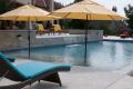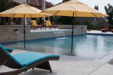 Patty and Tom carried the theme into the rest of the 2 ½-acre property, hiring Baker Pool & Spa to install a pool with a children’s splash pad and a 4-inch-deep tanning shelf. It’s surrounded with a neutral stone retaining wall, bold deck chairs, wicker lounge furniture and – perhaps a bit surprising – faux palm trees and turf.
