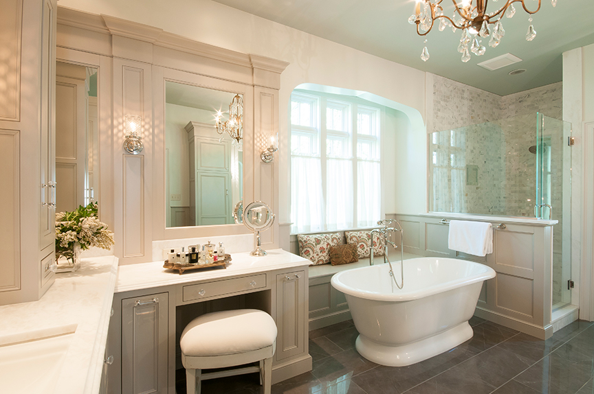 When approaching the master-bath remodel of this historic St. Louis Tudor, Karr Bick Kitchen & Bath made certain the new design honored the original details found throughout the rest of the home. A Tudor arch window became the focal point of the room, so Karr Bick placed a freestanding tub beneath the window and lined the walls with custom wainscot furniture panels. A window bench was created in an unfinished floor area discovered during demolition. A chandelier centered in the arch leads your eye that way.