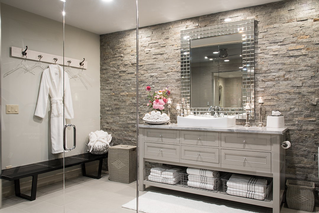 Unique and creative, this bathroom is calming and spa-like. The dry stacked-stone wall is a nice anchor for the space. The glass wall that separates the bathroom from the workout room makes the space feel expansive and is very cool!