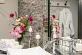 The true escape in this bath is the steam shower. At the push of a button, you can melt into a soothing cloud of eucalyptus-scented steam. Covered in 78”x78” onyx tile, the shower is equipped with a 10” square rain showerhead, a handheld shower and body sprays for the ultimate relaxing experience.