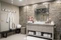 A glowing stacked-stone wall surrounds the vanity and is the dramatic focal point of the room. The stone is the perfect contrast to the smooth linen pattern on the tile floor. The furniture-style vanity features an open shelf on the bottom for storage of bathroom linens.