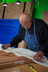 De LaVenta’s paintings are energetic and expansive. He works with acrylic on canvas, adding materials that he makes himself, like powdered nickel and bronze. Using the knowledge gained from his years in construction, he’s currently developing a new paint which he promises will “capture and move the light.”