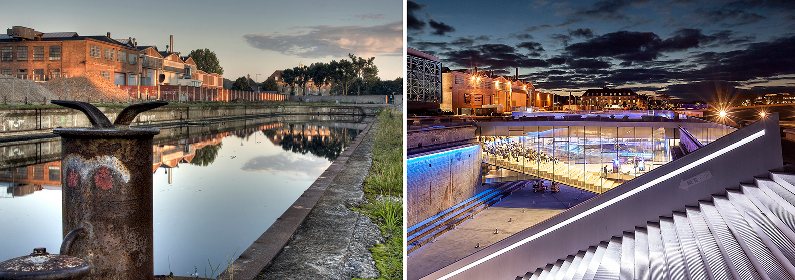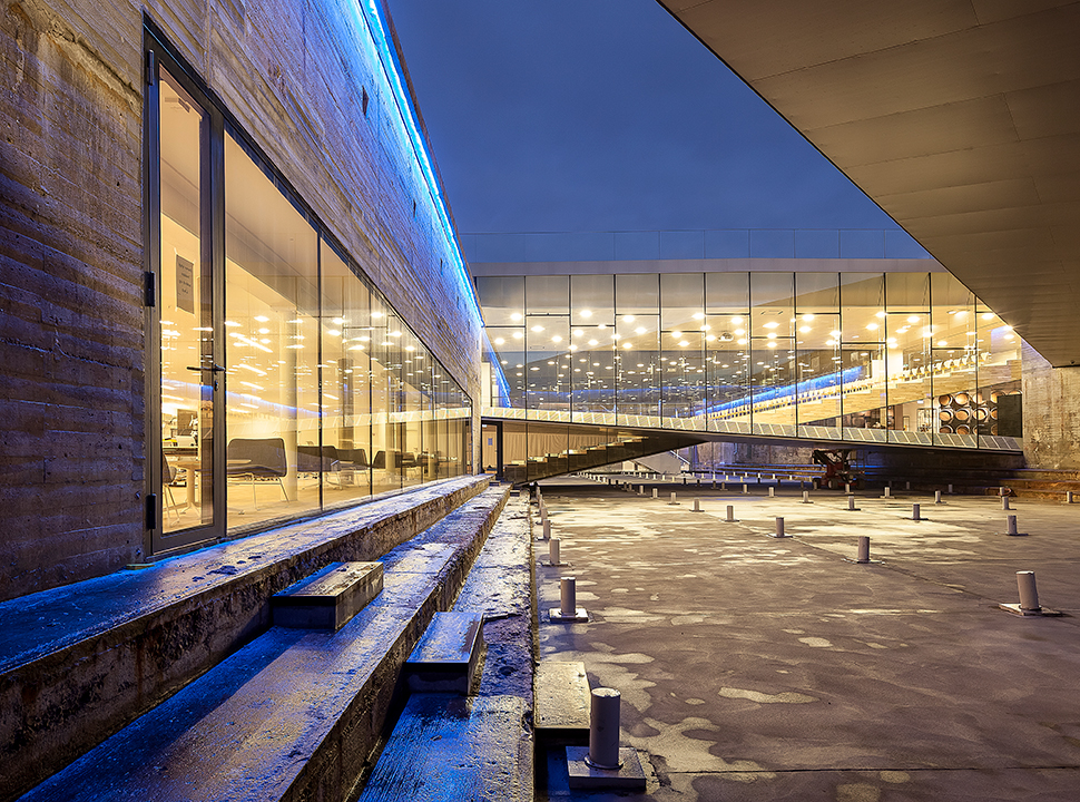 The Danish Maritime Museum is located between one of Denmark’s most important and famous buildings, the Kronborg Castle, and the Culture Yard, a new, ambitious cultural center. The firm BIG proposed to place the museum underground just outside the wall of the dock in order to preserve the dock as an open outdoor display. The 60-year-old dock walls were left untouched, and the galleries are below ground and arranged in a continuous loop around the dock walls. There are a series of three double-level bridges that span the dry dock and connect museum visitors to different sections of the museum.