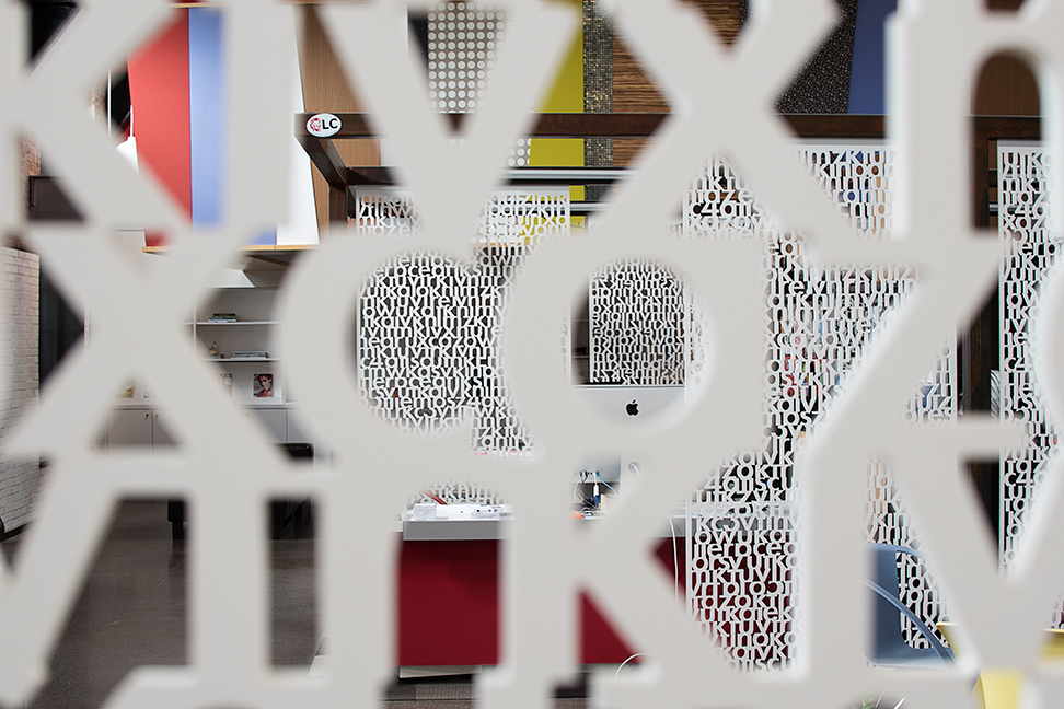 The result is a modern warehouse bursting with colors, textures and shapes. Many pieces of the original building were repurposed during the construction process. Varying ceiling heights, colors and lighting divides the ground floor into multi-functioning spaces. In the main work area, iron posts frame individual cubes with hanging space dividers allowing the layout to continually change over time. A brick patio, accessible from the employee lunch room through an overhead door, was repurposed from bricks found in and around the building. A second-floor mezzanine houses more offices, work areas and meeting space.
