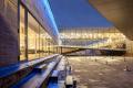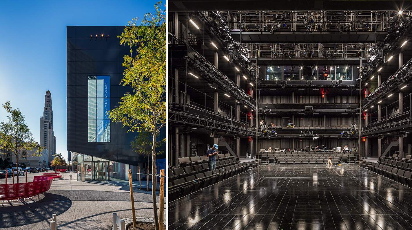 The Theatre for a New Audience at Polonsky Shakespeare Center serves as a laboratory for modern theatrical interpretation of classical plays. The firm H3 Hardy Collaboration Architecture served as the designer, and the new building brings a new presence to the Brooklyn Academy of Music Cultural District. The simple form of the building belies its structural complexity and intricate acoustical isolation from the city’s exterior and subterranean noise. The exterior skin is covered in large gunmetal gray metal panels. The volume of the building projects outward from its site with the second-floor lobby dramatically cantilevering over the main entrance below. The 299-seat proscenium theater sets a stark contrast to the naturally lit lobby. The finishes and furniture in the theater are all black with no visual distraction from the activity on stage.