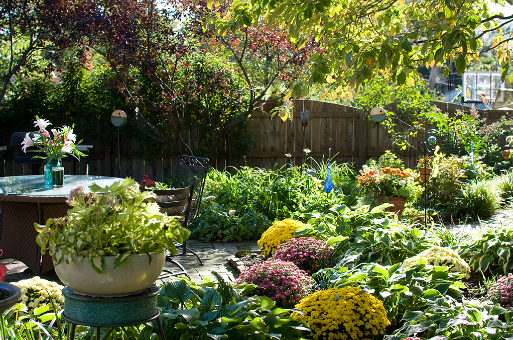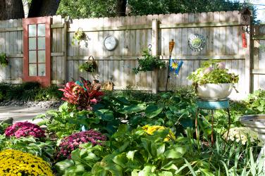 When she moved into her house more than 20 years ago, Deb recalls having an immediate vision of what the yard could become. “There was an old, plastic greenhouse and a barbeque pit that I got rid of,” she recalls. In place of those relics, she planted 47 trees, 11 of them dogwoods, that “provide shade, flowers and fruit. In spring the garden looks like an Impressionist painting. “ In addition, she erected a wood privacy fence that she now uses as a “blank canvas” on which to hang a variety of decorative items. Particularly prominent is a large melon-colored door with mirrors where there would normally be glass. “Then you look at it, it appears to be a pathway to another garden….and it is…a garden of the imagination,” Deb explains. Favorite plants include her big blue hostas with their fragrant blossoms and the sweet-smelling Miss Kim lilac planted next to the deck.