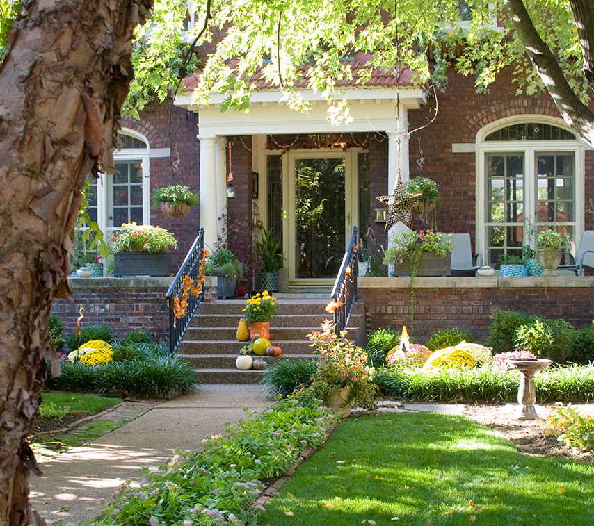 Just approaching Dr. Deb Carlin’s front door is a treat. Stroll along the walk and you encounter a planter overflowing with greenery that looks just like a red-rubber boot. Step a few more feet and encounter a colorful glass bauble reflecting light. In the autumn watch for pumpkins and squash tucked in among the plants. At the festive front porch seasonal ribbons twine their way through the wrought-iron railings and pumpkins, squash and mums cascade down the steps.