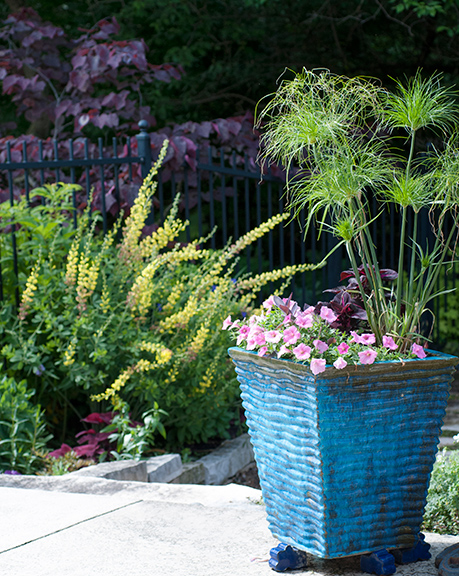 Throughout her garden, Leigh employs plant-filled containers to fill in bare spots. “I love bleeding heart,” she says, “but when the foliage goes away in the heat of the summer, it leaves a hole in the garden.” She also loves to pick up both whimsical and beautiful artifacts to add interest to the plant material. Occasionally, she worries there might be one-too-many objects in the landscape. “I’ve told friends to stop me if it looks like I am hoarding,” she says with a laugh.