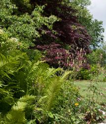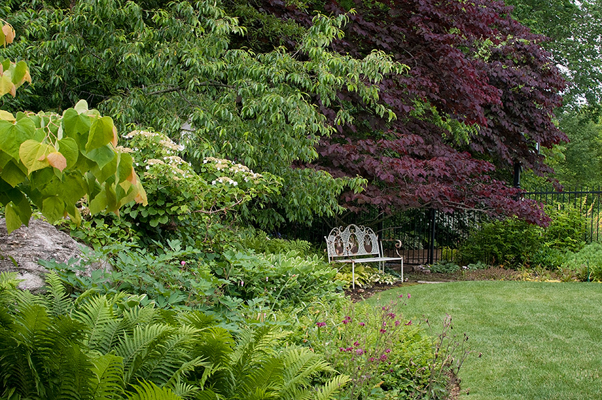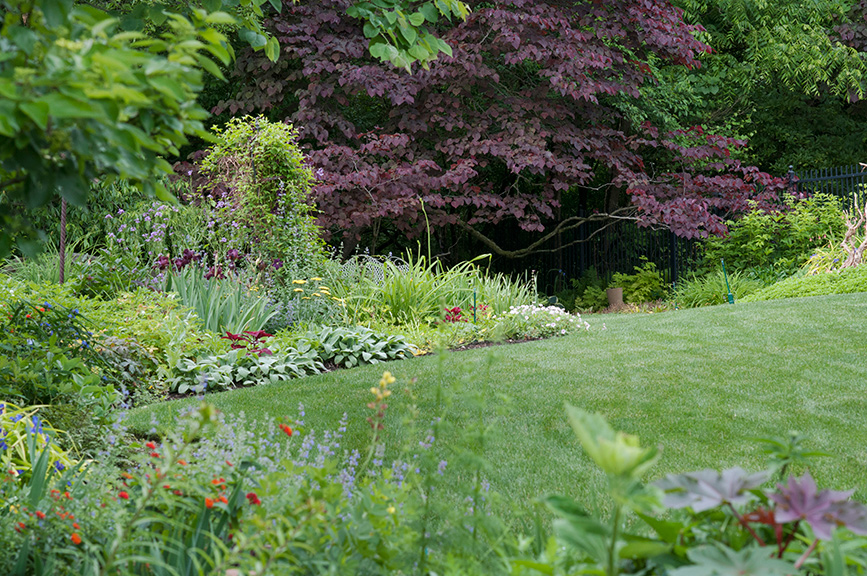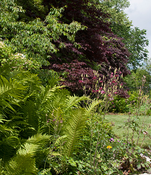 In the years she has been gardening, Leigh, now a certified Master Gardener, has learned by trial and error and currently reigns over a yard composed of graceful beds filled with colorful shrubs, 80 percent perennials and 20 percent primarily self-seeding annuals, such as poppies, nigella and salvia. She loves the color provided both by flowers and plants with bright-colored foliage. “I have an obsession with coleus,” she says. The rich purple foliage of “Forest Pansy” red bud is another favorite, which she uses in numerous spots throughout her landscape. A second obsession, she admits to, are plants with chartreuse foliage. Another garden favorite is the Oriental Kousa dogwood, which blooms later than our native dogwoods and bridges the gap between the spring and summer flowering plants.