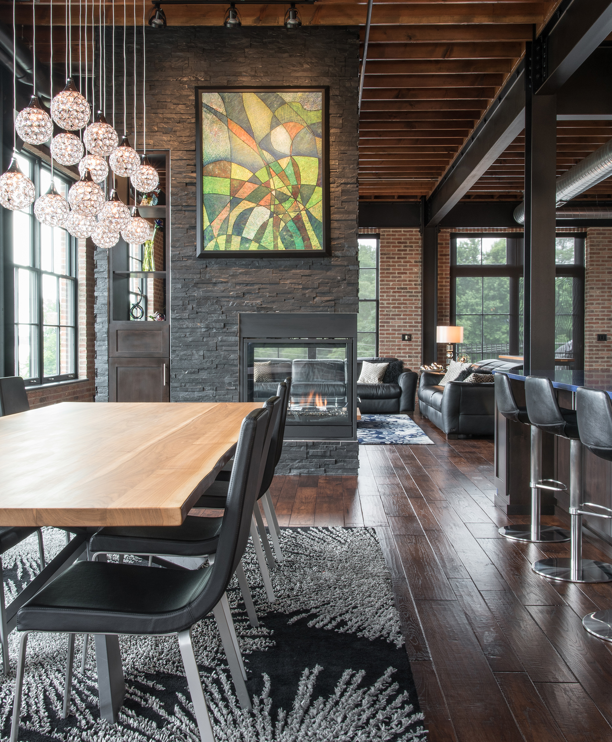 For an industrial touch, distressed wood floors by Union Furniture, who also provided the tile found throughout the home, make the space feel as if you are in an old warehouse. Along with brick walls, the black drainpipes were also left exposed and filter water runoff through the house, as there are no outdoor drains. Furnishings in the great room include two black leather sofas, an Italian wood-and-glass coffee table by Cattelan Italia and two Le Corbusier-style chairs covered in cowhide. Brought from their previous home, the area rug brings in a touch of blue, and the color is carried into the sleek and stylish kitchen. A double-sided, floor-to-ceiling fireplace divides the great room from the kitchen. Inspired by similar designs the couple had seen when traveling, the fireplace’s slate front helps break up the brick in the space and brings in a natural feel. Hanging above the fireplace, Rich and Donna found the vibrant painting by contemporary artist Rafael Gallardo while visiting Washington DC. “We love to collect memorable pieces from places we travel,” Rich says.
