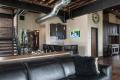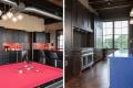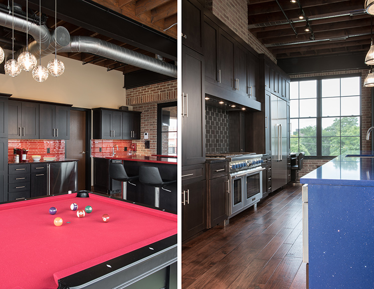 While the kitchen is the go-to spot for hosting holiday dinners and gatherings, the third story is where the party happens. With a red-topped pool table, u-shaped bar and doors that allow the space to completely open to the rooftop terrace, the third story is all about fun. Red dominates the space and stands out against the natural and industrial elements. The bar was designed in a u-shape so that no matter where you sit, you can take in the view.
