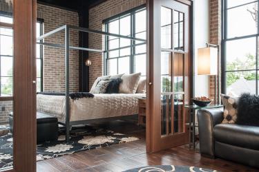 Down the hallway off the main entry, the couple’s master bedroom is filled with natural light from the parallel walls of windows. Softer, more neutral colors make this master retreat a calming escape. For further privacy, a set of sliding doors can be closed to separate the space into a bedroom and den. Industrial touches include exposed brick walls and a steel canopy bed frame.