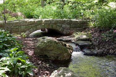 A key attraction of the English Woodland Garden is the meandering brook that flows from a pool in the northeast corner, under several limestone bridges and into the Japanese Garden lake by way of a waterfall. Visitors can track the stream on a winding path of stepping stones, observing the streamside plantings of primroses, ferns, cardinal flowers and some ground orchids. Over 400 limestone boulders are carefully placed along the streambed, providing a further naturalistic component. A second water feature is a bog display of plants that thrive in wet soils or aquatic habitats.