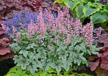 “Pink Fizz Foamy Bells, Heucherella gives the shade garden the punch to keep the party going all summer long. A charmer, it delights us with large, deeply lobed silvery-green leaves with rich-wine red-to-deep-purple veins. In summer, pink champagne flowers burst forth on wiry stems. Pink Fizz was trialed in multiple shade gardens throughout St. Louis, and the results have the test gardeners raving.” Ann Lapides, Sugar Creek Gardens.