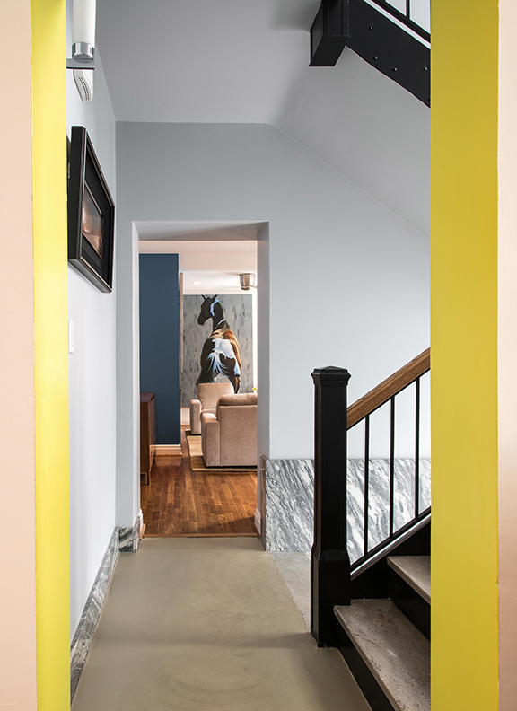 Combining a half-dozen of the original apartment units, the townhome’s floorplan is truly unique. The building’s two front bays have been converted to multi-level atriums, and a central staircase leads from the entry to the third floor, with separate living spaces on either side of each landing. Formerly apartment entries, the opposing doorways are left open, and the thick doorjambs are painted in various colors to create a subtle visual transition from one space to another.