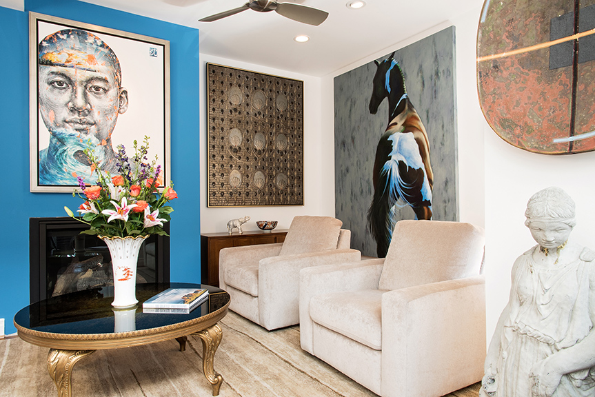 From the outset, the owners’ goal was “originality” and “fun.” Over time, they’d acquired a considerable amount of artwork and a number of family pieces, which would serve as the foundation for the home’s décor. John explained that Michael’s professional career had taught him “how to use art to beautify a space,” then added his personal philosophy, saying, “Art needs to invoke conversation.” As a result, most of the furnishings are streamlined and neutral in color, focusing attention on the vivid, intriguing art pieces.