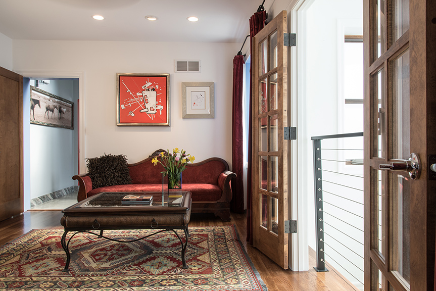 The townhome’s second floor houses the master suite, which overlooks one atrium, with an office and another atrium-view living room across the hall. Recycled barnwood lends a strong masculine design element to various wall surfaces of the open bedroom/sitting area and creates an interesting background for the artwork, including two more Powers equine paintings. Opposite the handsome sleigh bed is an antique camelback sofa, reupholstered in claret red velvet and set on one of the home’s several colorful Pak Kazak area rugs.