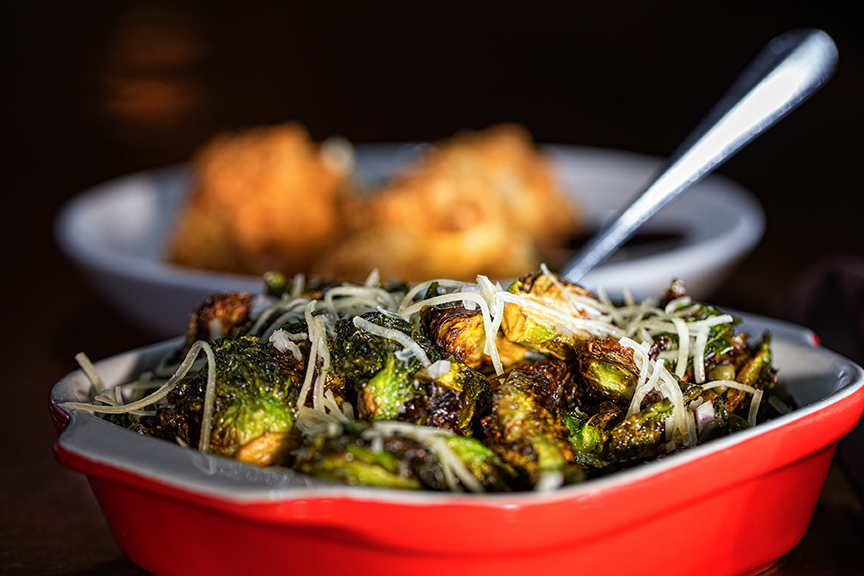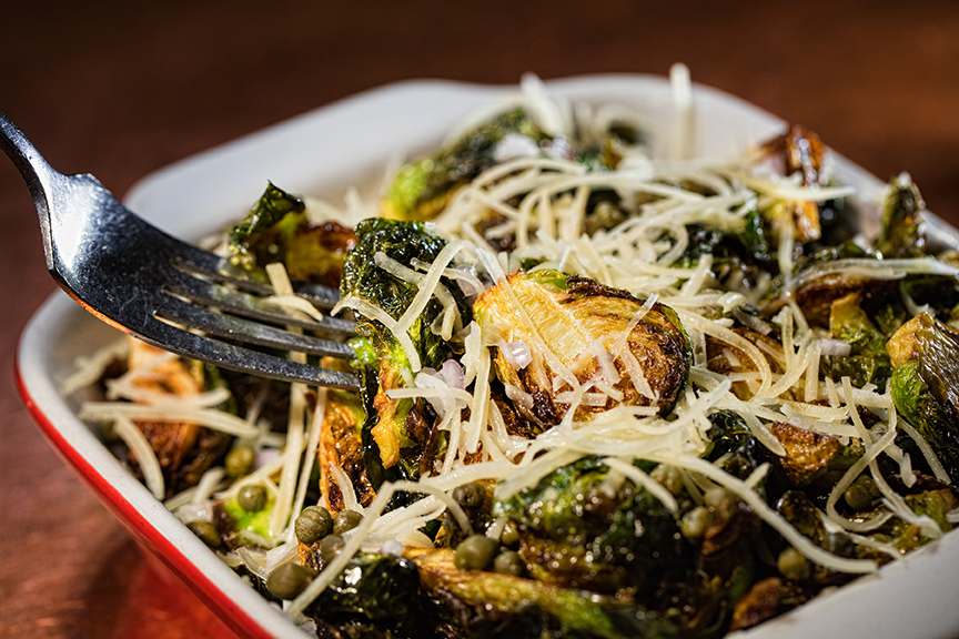Brussels sprouts: “Probably everyone’s favorites,” Cleveland says. Like all the side dishes on the menu, they’re served in a size meant for sharing. The restaurant cooks them quickly in a deep-fryer, but home cooks can use a hot oven. As soon as they’re cooked, the sprouts are tossed with Parmesan cheese, capers, shallots and the house lemon vinaigrette, made with lemon juice instead of vinegar and olive oil.