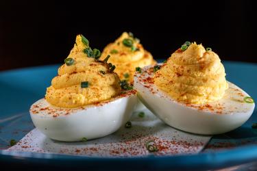 Deviled Eggs: Similar to traditional deviled eggs in technique, Cleveland-Heath uses the typical mustard, salt, mayo, however they also add Frank’s hot sauce and Parmesan cheese to the mix to spice things up.