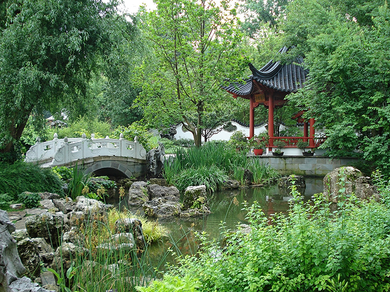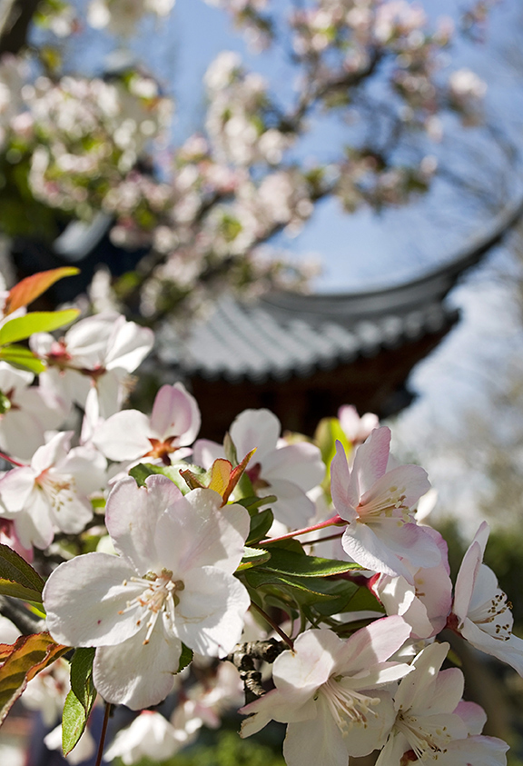 The designer carefully chose traditional plantings, many of which have spiritual significance or value in Chinese culture. Plantings include pines, bamboos, willows, plum trees, forsythia, hibiscus, wisteria, peonies, lotuses, rhododendrons and azaleas, with gardenias, citrus and pen-jing in containers. Many of these plants originated in China, which has the world’s largest temperate flora. A number of them were grown from seed collected in China.