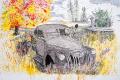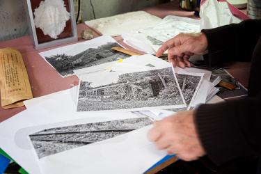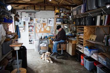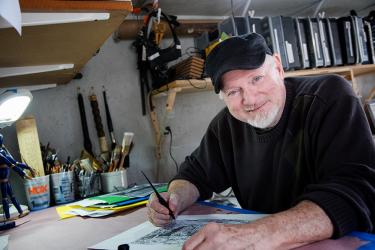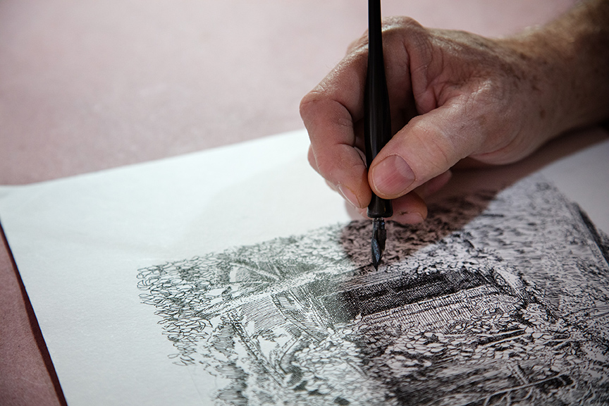 While Harris has captured many subjects in a variety of mediums over the years, one of his current passions is to draw buildings in pen and ink, using different pen nibs to make crisp, distinctive lines. He angles the lines using an etching technique called cross-hatching, adding more lines to create texture and tones. “I want the line to be seen. I don’t want something to be [solid] black. I want the lines to build up to black. I could use paint, but then I wouldn’t have the movement,” explains Harris.