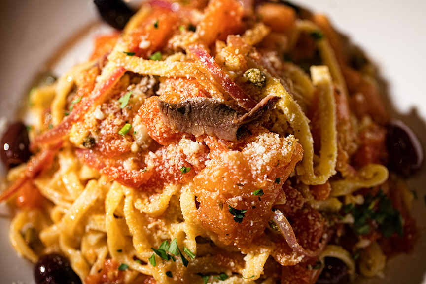 Puttanesca. Simple and fresh, this pasta dish features the classic stewed tomato-based puttanseca sauce flavored with onions, anchovies, capers, kalamata olives and oregano.