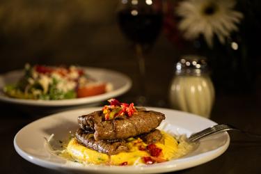 Beef Spiedini. Scarato prepares his Spiedini with very thinly sliced beef shoulder, stuffed with Volpi genoa salami, provolone and cherry pepper relish. It’s charbroiled to juicy perfection and served atop parmesan polenta.