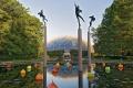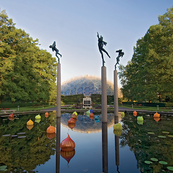The Milles Sculpture Garden consists of three large reflecting pools that span the Missouri Botanical Garden's central axis from the Spink Pavilion to the Climatron. Built in 1913, the pools have been fully renovated and display seven works by the late Swedish sculptor Carl Milles. Bald cypress trees frame the majestic vista, further accented by seasonal borders including pansies, tulips and summer annual displays. The tropical water lilies and giant Victoria water lilies peak in August and September and have been a major Garden attraction since before the famed 1904 St. Louis World's Fair. From spring through fall, colorful glass Walla Wallas by artist Dale Chihuly float and bob in between the water lilies of the central pool.