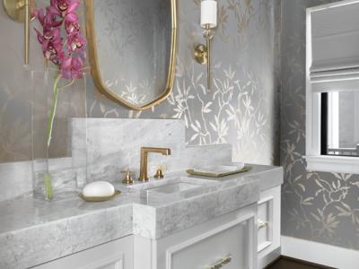 The homeowners were seeking a dramatic look for their small powder room but didn’t want to overwhelm the room’s 25-square-foot layout. ADJ Interiors struck the perfect balance between size and...