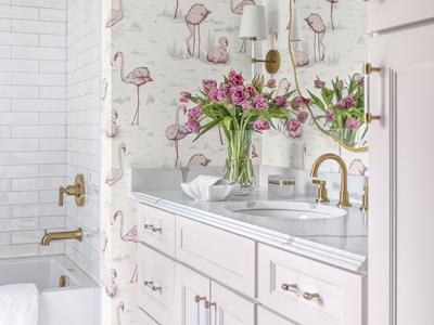The homeowners are tickled pink in this whimsical children’s bathroom. Castle Design set out to create a space that is both playful and chic relying on graphic patterns to infuse the small space...