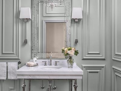 In need of an update to match the timeless qualities of the Richmond Heights home, this formal powder room was given a fresh flair. The washstand vanity acts as the centerpiece of the powder room...