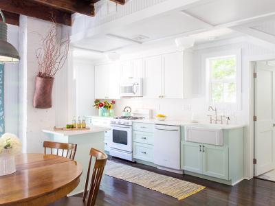 The kitchen in this summer cottage was motivated by color. Tucked between two bluffs, the vacation cottage is full of charm. As a second home, designer Karr Bick had to be frugal in design...