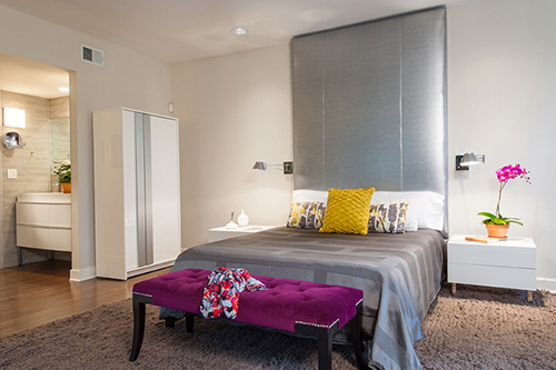 Inspired by boutique hotels the owners enjoy when traveling, this master bedroom features a custom vinyl headboard with platinum python finish, low-profile nightstands and a deep-pile New Zealand wool carpet.