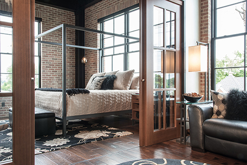 Soft, neutral colors make this master retreat a calming escape. For added privacy, a set of sliding doors can be closed to separate the space into a bedroom and den. Industrial touches, including exposed brick walls and a steel canopy bed frame, complete the contemporary look.