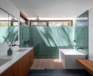 Tucked into the hills of Emerald Hills, California, this 99-square-foot master bathroom transforms daily rituals into spa-like experiences. The curbless shower—anchored by a recessed teak slat floor—offers seamless walk-in access while nodding to luxury with lush green Fireclay tiles and a skylight that bathes the space in natural light. The client's vision for modern simplicity comes to life through clean lines, floating teak cabinetry, a solid surface soaking tub and radiant slate floors.